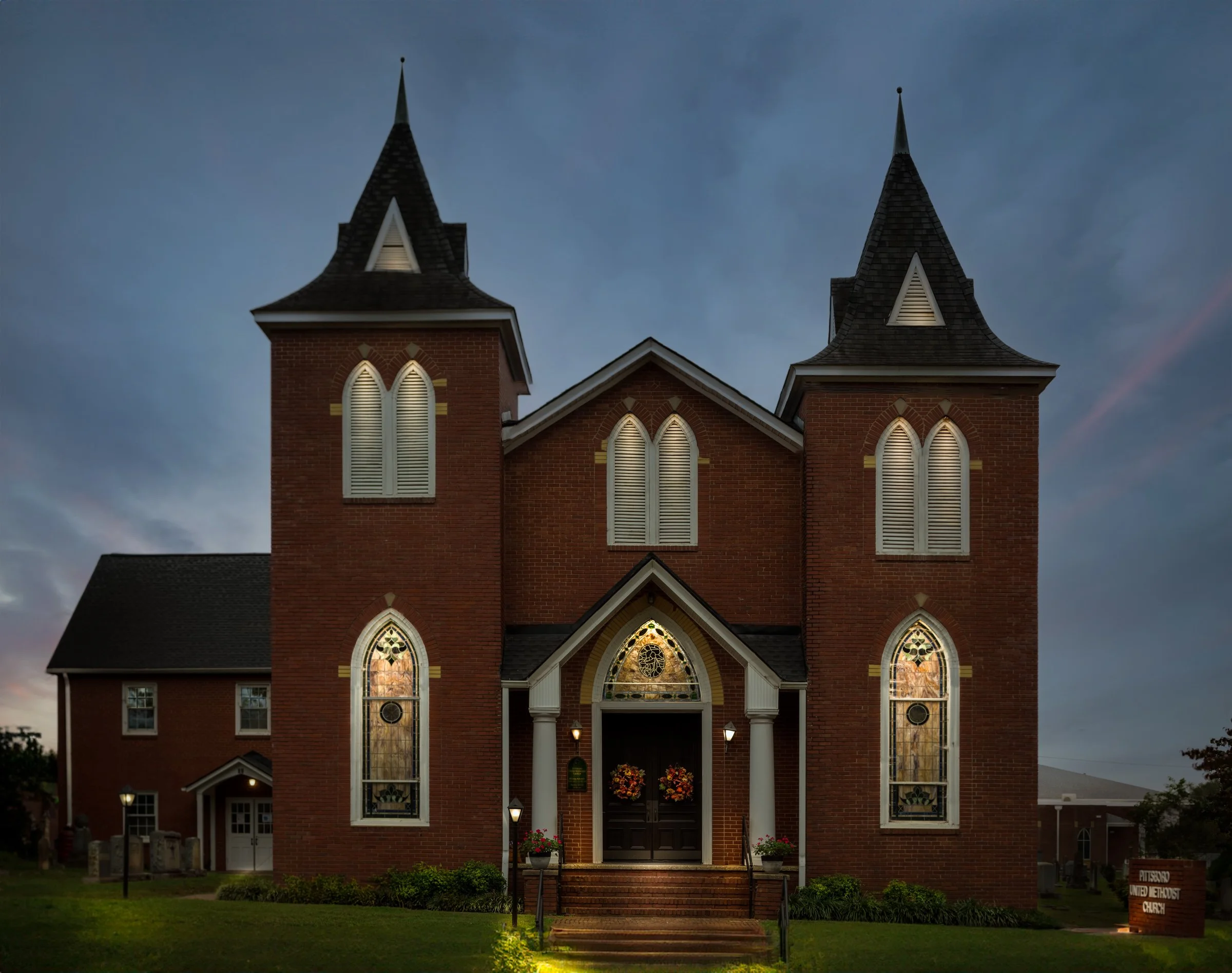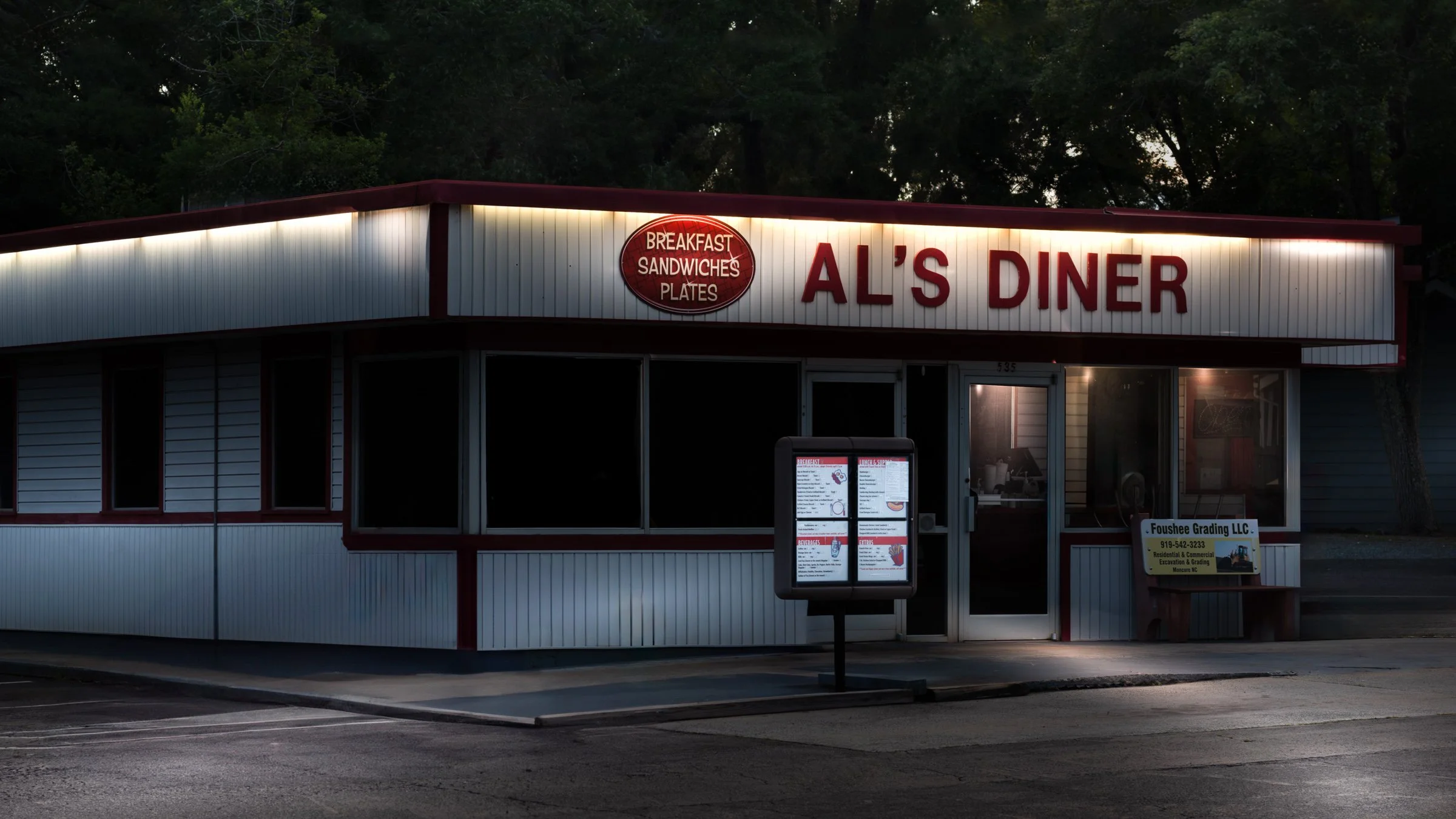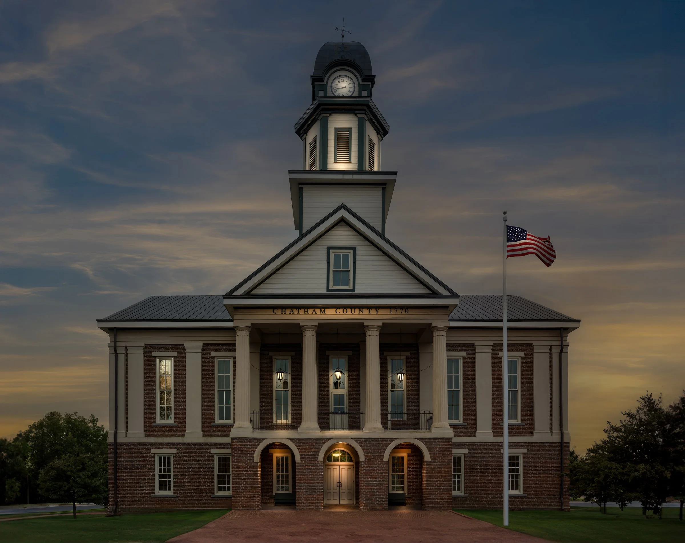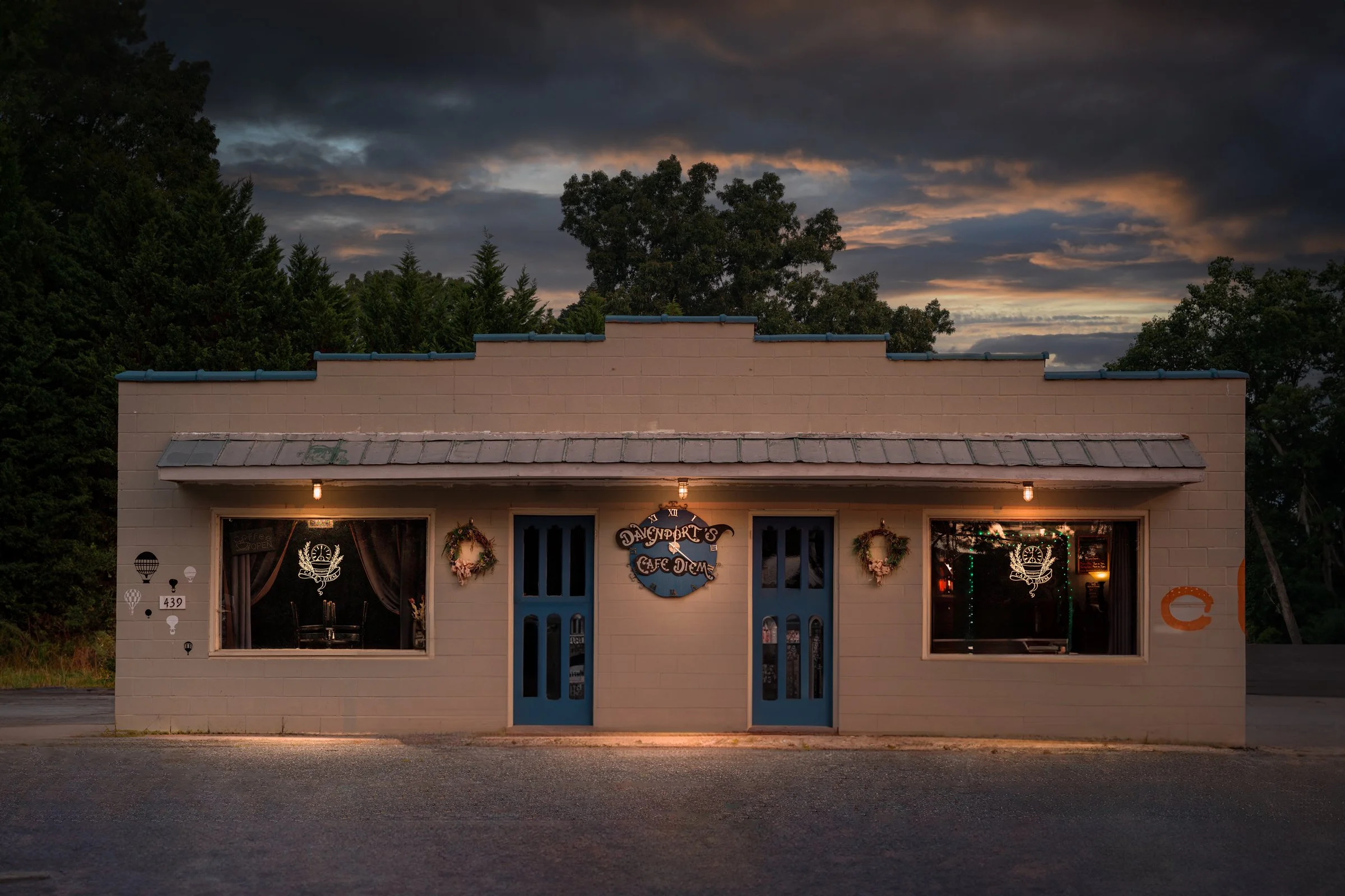 Beyond the studio, I bring the same sensibility to my Pittsboro nightscapes. These photographs begin at dusk, when natural and artificial light mingle. Through post-processing, I add light to create mood and drama, transforming streets, storefronts, and historic architecture into cinematic visions of place. These images are not simple records but imaginative reinterpretations—portraits of Pittsboro caught between its history and its evolving present.